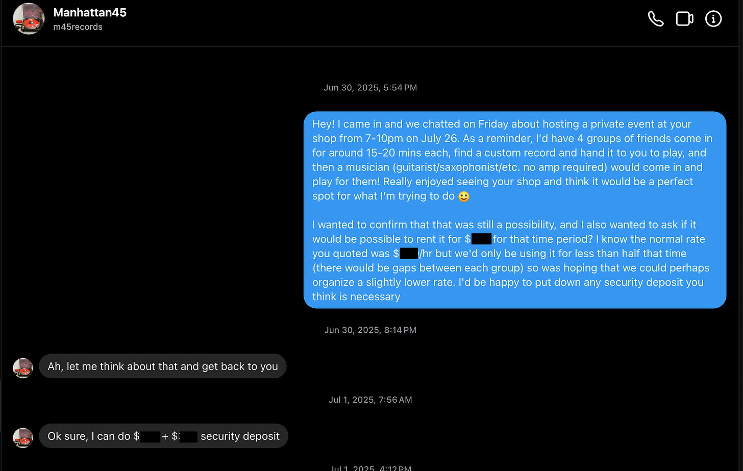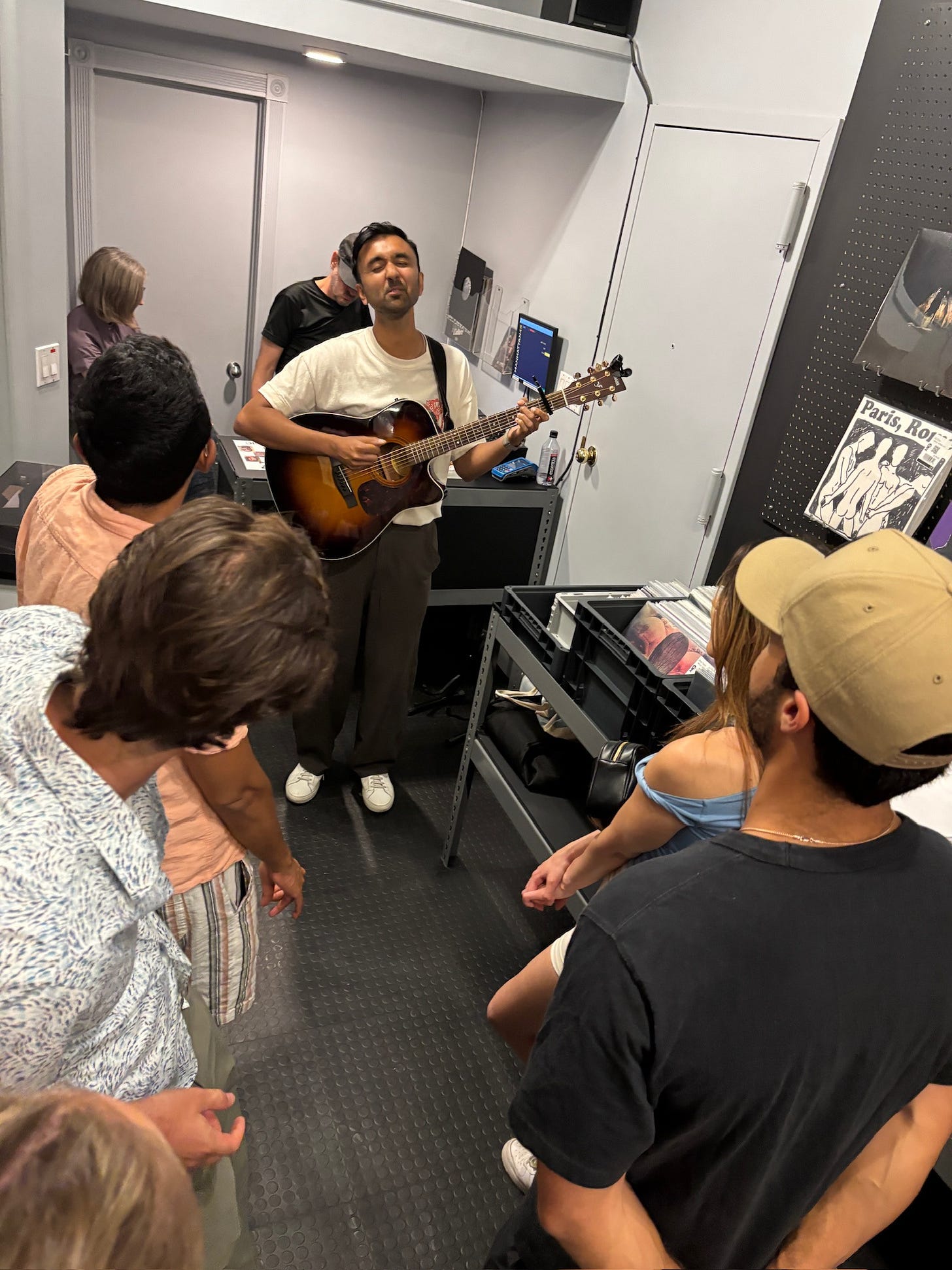 Once my friends arrived at the store, the clerk handed them another envelope with a riddle that pointed to where the record was in the shop. After finding it, they gave the record to the clerk to play on the store’s sound system. The only track was my voice over my favorite song, Innerbloom, reflecting on all the music we’ve shared at concerts, festivals, and jazz bars, and inviting them to listen to one more song together. As the message ended, the record began to skip and then stopped. Right on cue, a musician entered the store with a guitar and played a 10 minute set!