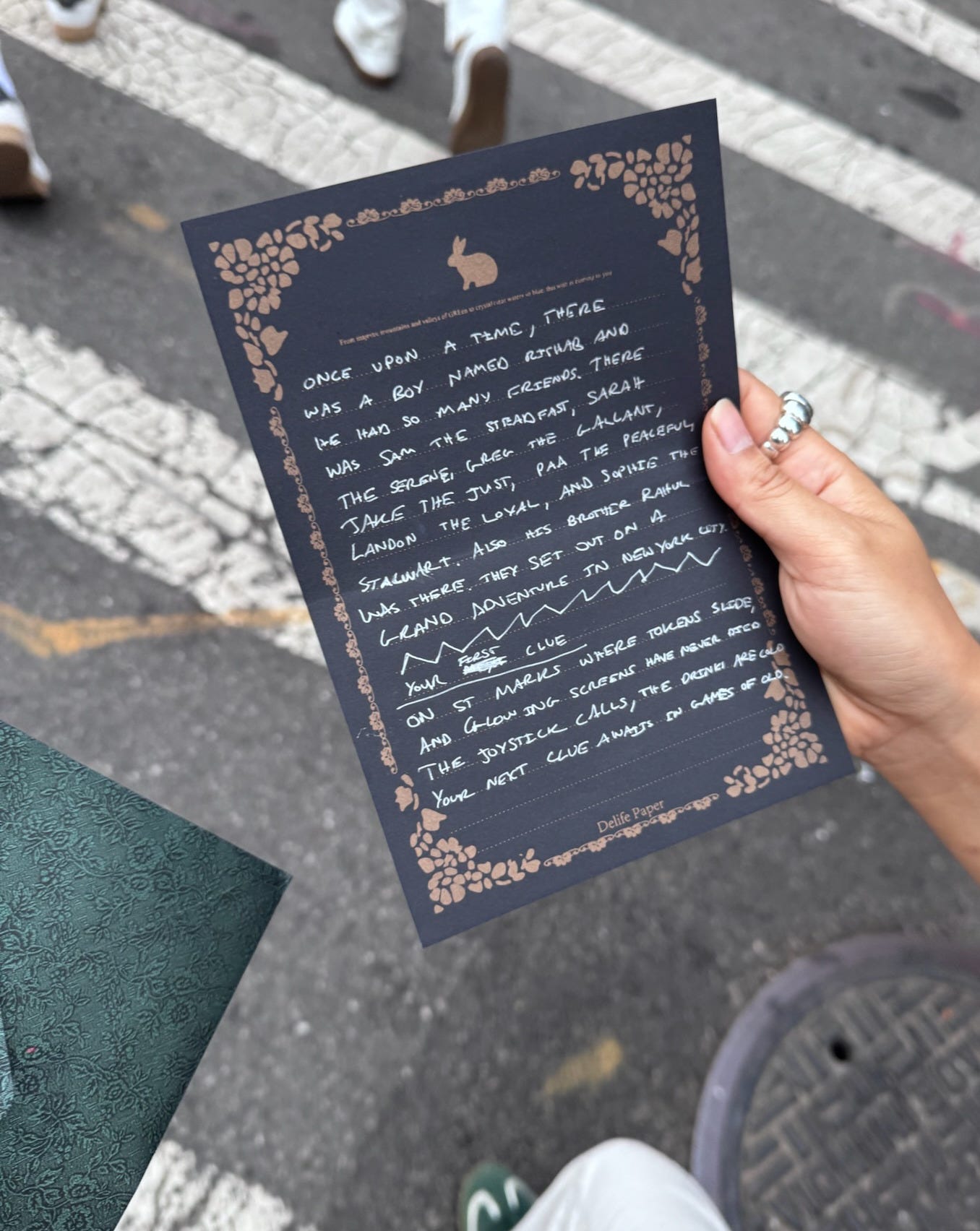 At 7pm, I met everyone at the bar and split them into 4 groups of 8 people each to keep things more intimate. Trying not to reveal too much, I gave each group an envelope containing part of the story and a riddle to the next location.