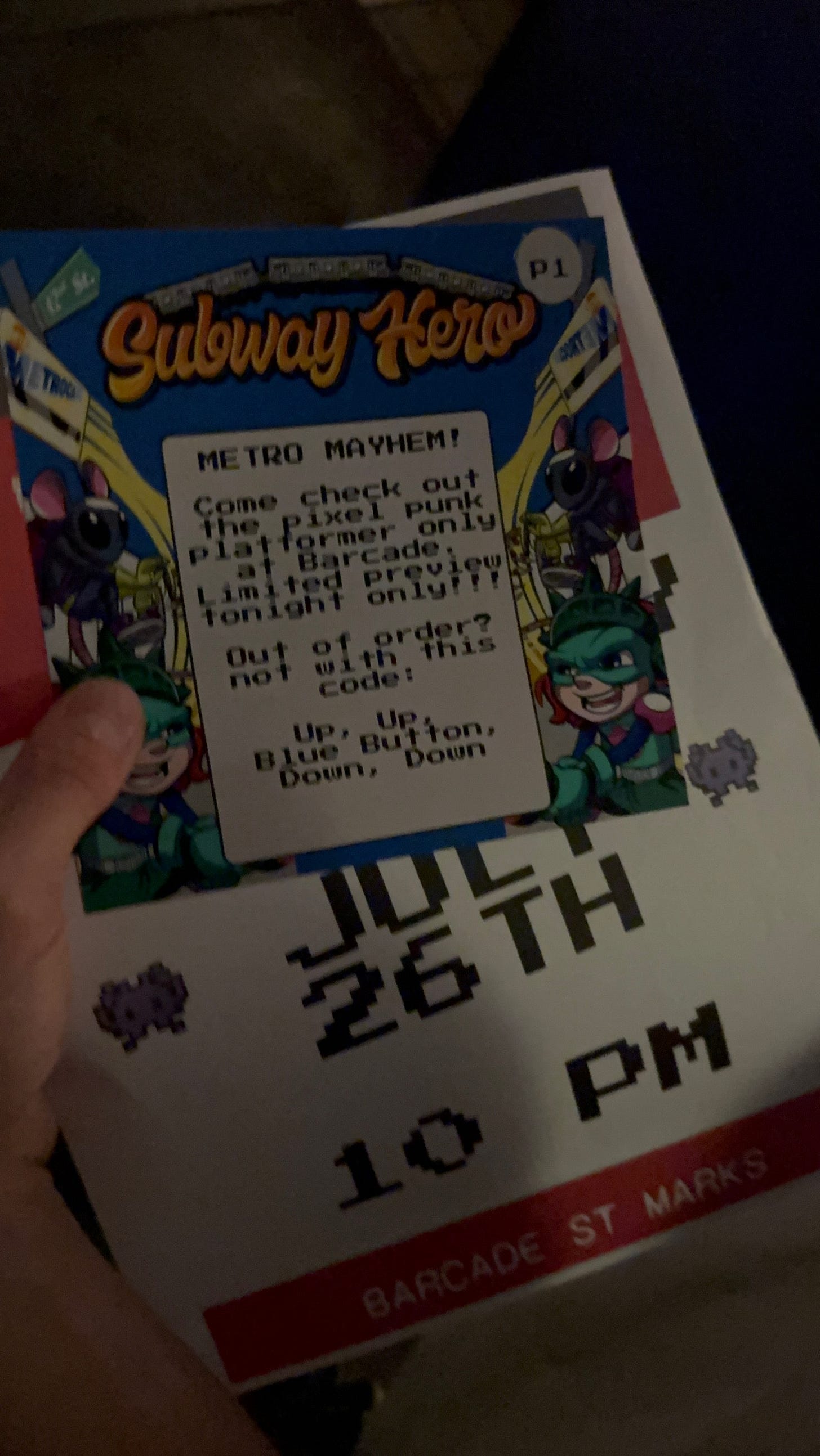 Really, I have to give most of the credit here to my friend Greg who when I told him about this ARG idea years ago went out and bought a whole arcade game kit on Etsy and then assembled it, commissioned art, and set it up (the screen is just a mounted monitor, the game is a javascript game in a full-screen browser and it’s running on a little windows machine stored in the back). He also made the subway-themed frogger game and I just added in the fun secret level stuff afterwards.