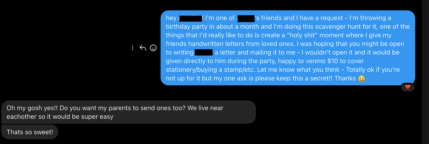 Lastly, getting handwritten letters from family members was just a lot of trial and error. I sent approximately 15-20 instagram and linkedin messages to family members of friends before I hit my goal of 5 people who were down to write a letter (one for each group plus a buffer in case a letter didn’t arrive or someone got sick). I was a little scared of the ask since it seemed a bit weird but everyone was super nice about it and the only reason that the other 10-15 messages didn’t work out is likely that those people did not see them (I never got a no from anyone!).